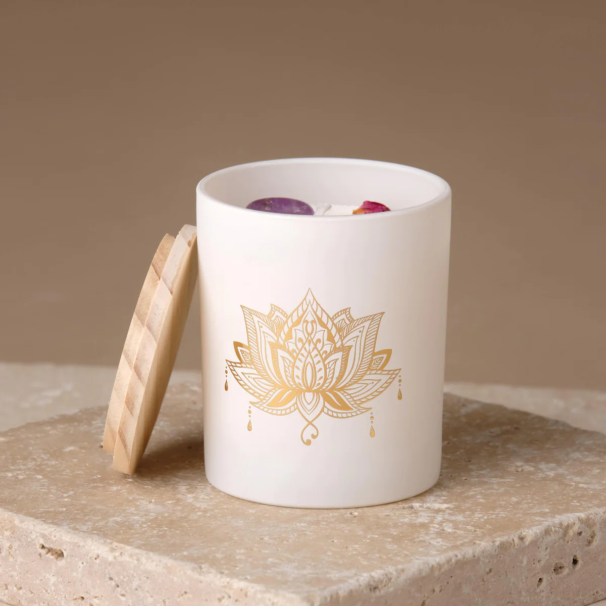 Une bougie raffinée en cire de soja, ornée de fleurs et pierres précieuses, qui diffuse un parfum délicat et crée une atmosphère magique et apaisante.