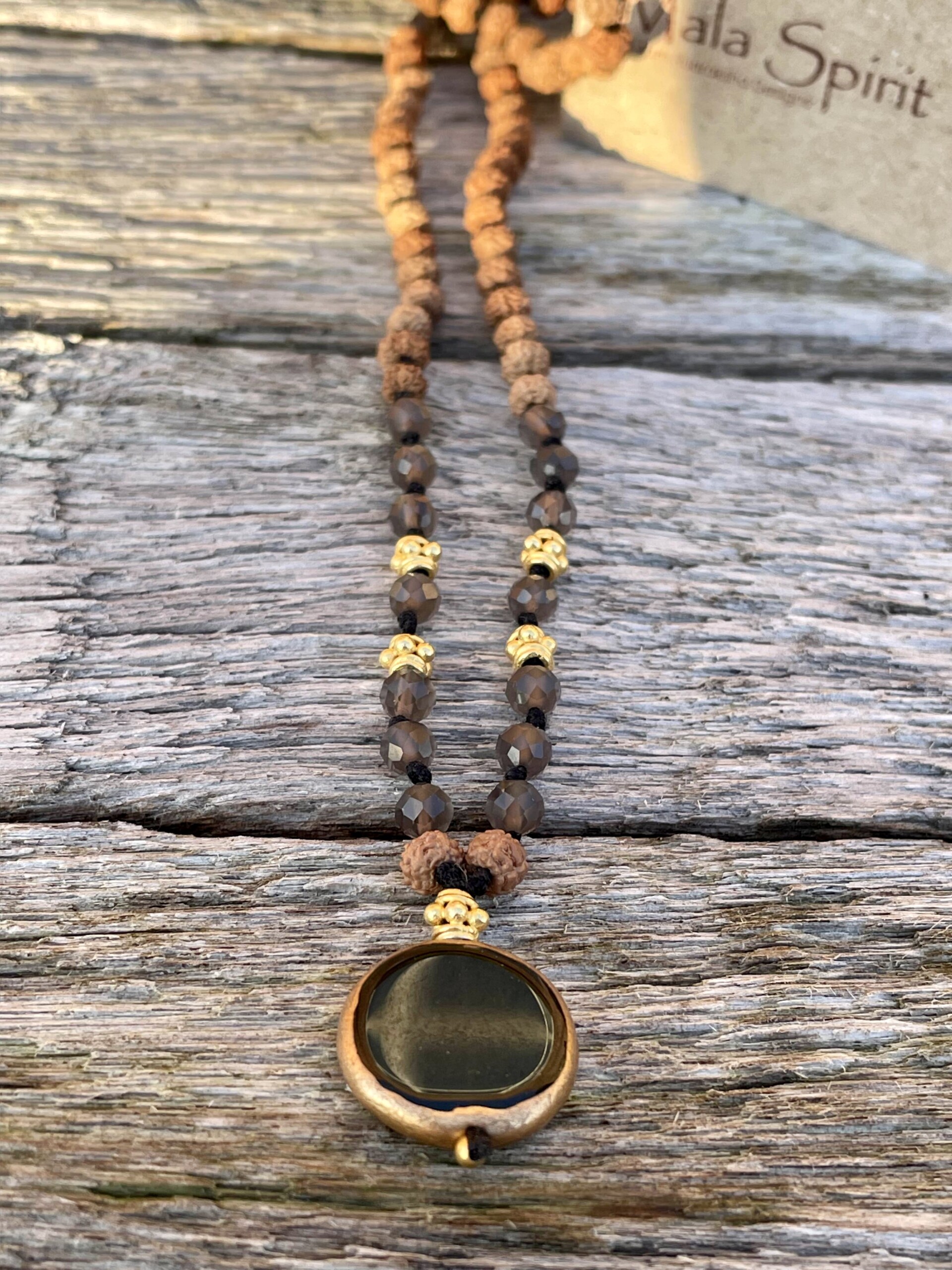 Collier Mala Spirit en obsidienne, Smoky Quartz et Rudraksha, fait main en édition limitée, apporte élégance et présence discrète pour votre quotidien.