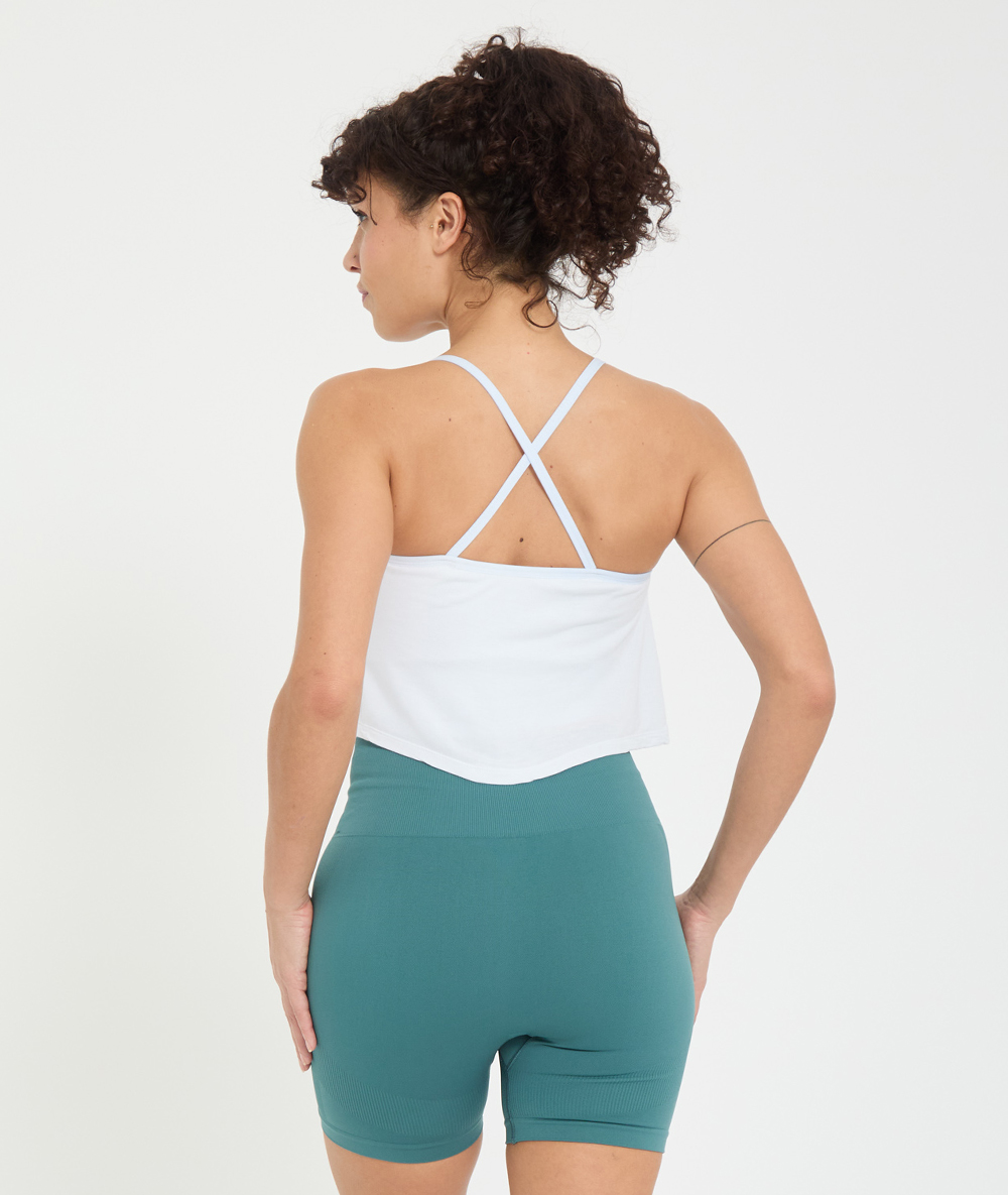Débardeur crop top Yoga Searcher en fibre de bambou, avec brassière intégrée longue et bretelles croisées pour confort et maintien naturel.
