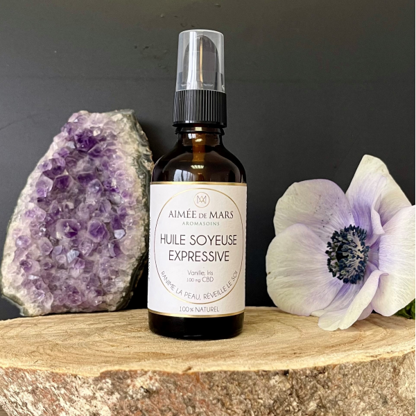 Huile soyeuse Expressive au CBD et huiles bio, offre une texture douce et légère pour accompagner les soins du visage et du corps.