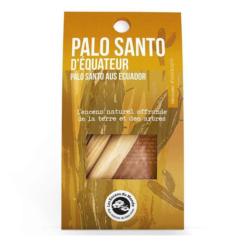 Bois de Palo Santo d'Équateur. Important: – selon la marque Encens du Monde, cet encens provient des arbres et des branches tombés à terre. Un phénomène de maturation de l'odeur du bois se produit dans ces conditions et cela n'exerce pas de pression écologique sur la ressource naturelle. Yoga Nest vous conseille toutefois d'utiliser la Palo santo avec parcimonie, comme un cadeau de la terre et comme ce qu'il est… un Bois saint. – Palo santo (Bois sacré) est une appellation espagnole qui désigne également d'autres espèces d'arbres dont Bulnesia Sarmientoi que l'on trouve dans le nord de l'Argentine, au Paraguay en Amazonie et qui est une espèce protégée.